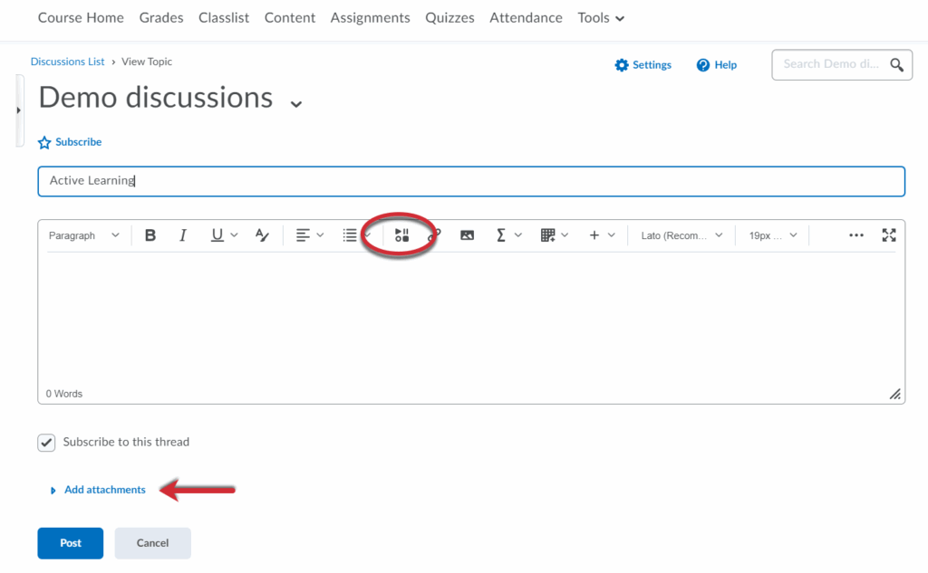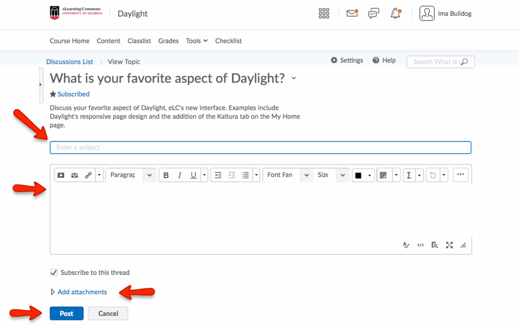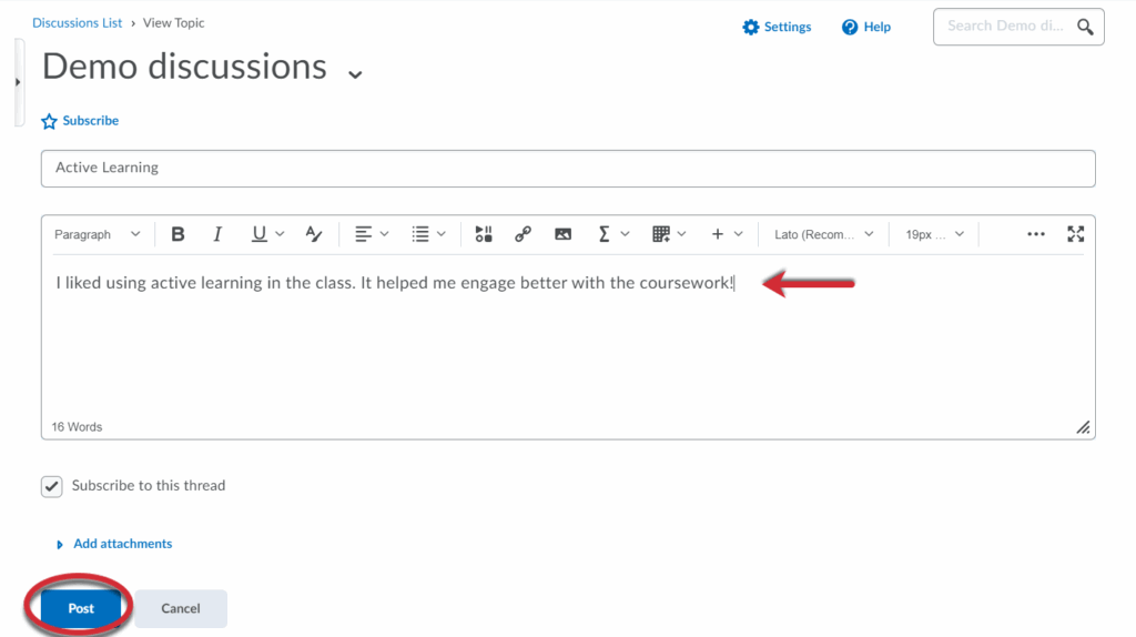 - Type a response in the body of the thread. Attachments, hyperlinks, graphics, and videos can be added to responses. Click Post when complete.