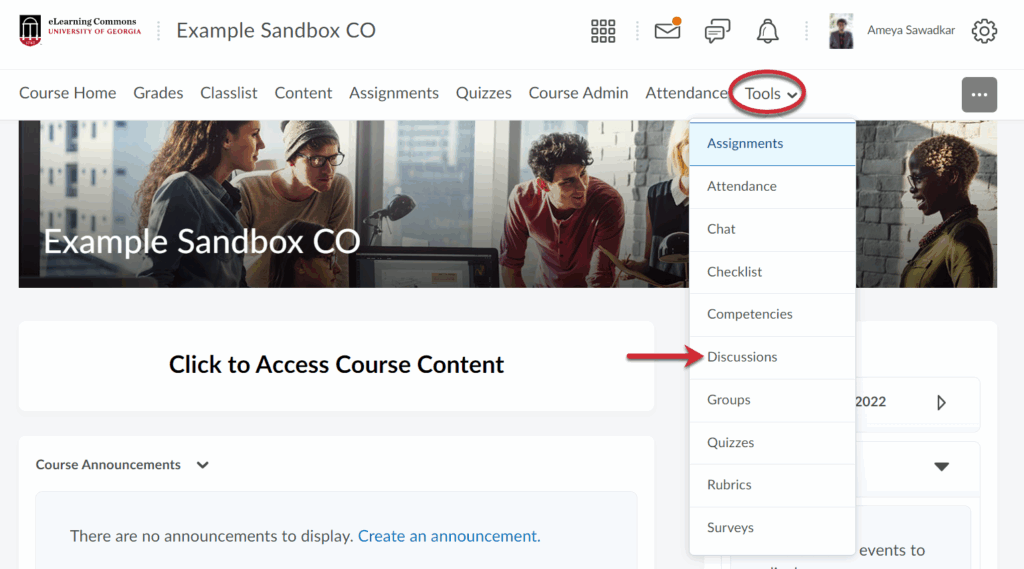- The Discussion Tool can be located from the Course’s Navigation Bar using the Tool’s Drop-Down Menu. Click on Tools and then Discussions.
