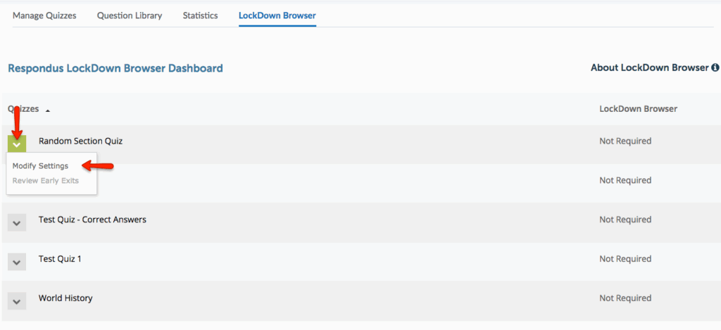 - If you need to modify your Respondus Lockdown Browser settings, click on the Lockdown Browser tab on the Quizzes navbar to return to the Lockdown Browser configuration screen.