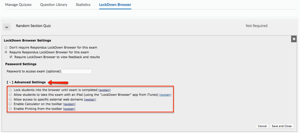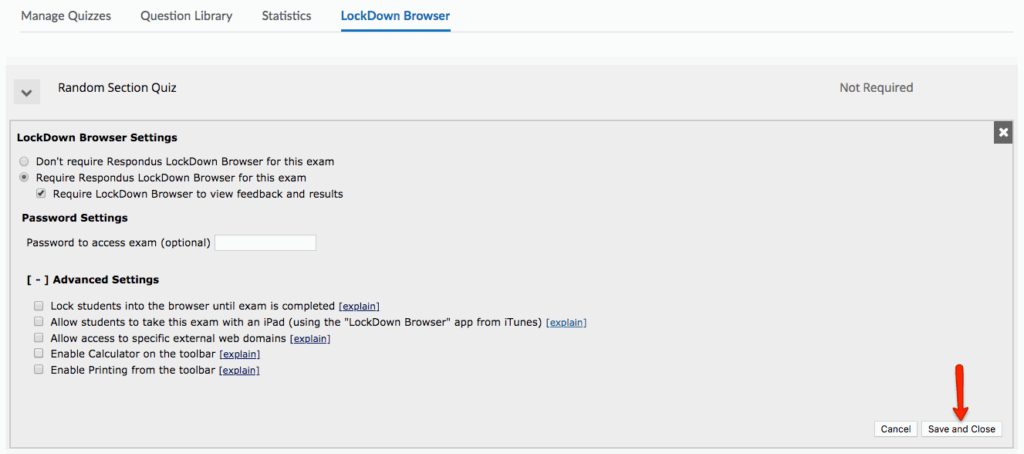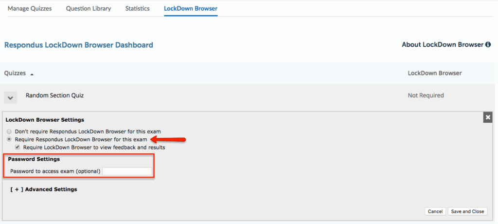 - Check the Require Respondus Lockdown Browser for this exam. If you don’t want to require Lockdown Browser for viewing quiz results and feedback, uncheck that option. You can also add a password to access the exam on this screen.