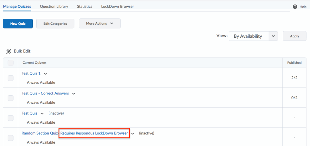 - On the Manage Quizzes screen in eLC, the quiz that you configured will say Requires Respondus Lockdown Browser after the quiz title. This is also visible to students.