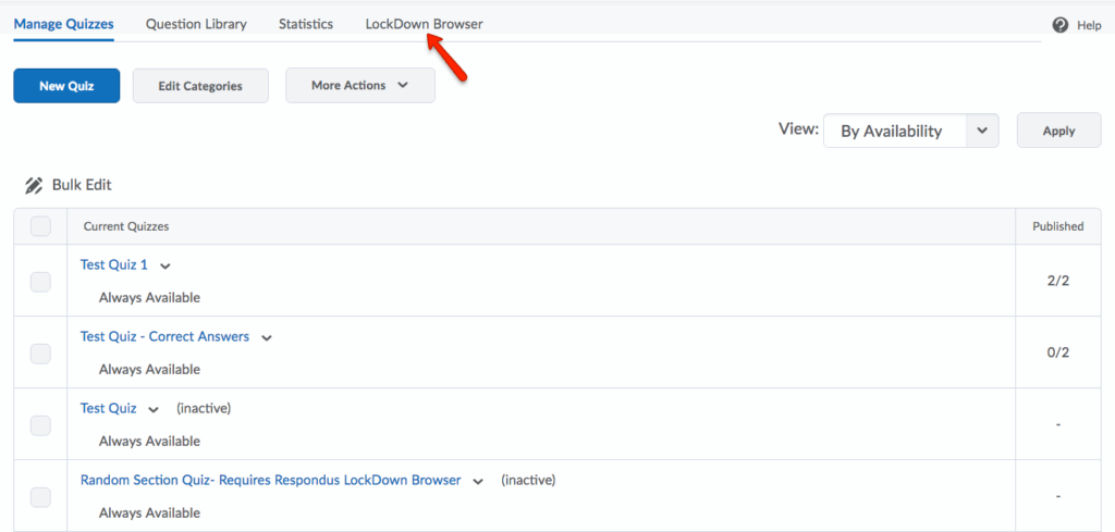 - Click the Lockdown Browser tab on the Quizzes navbar.